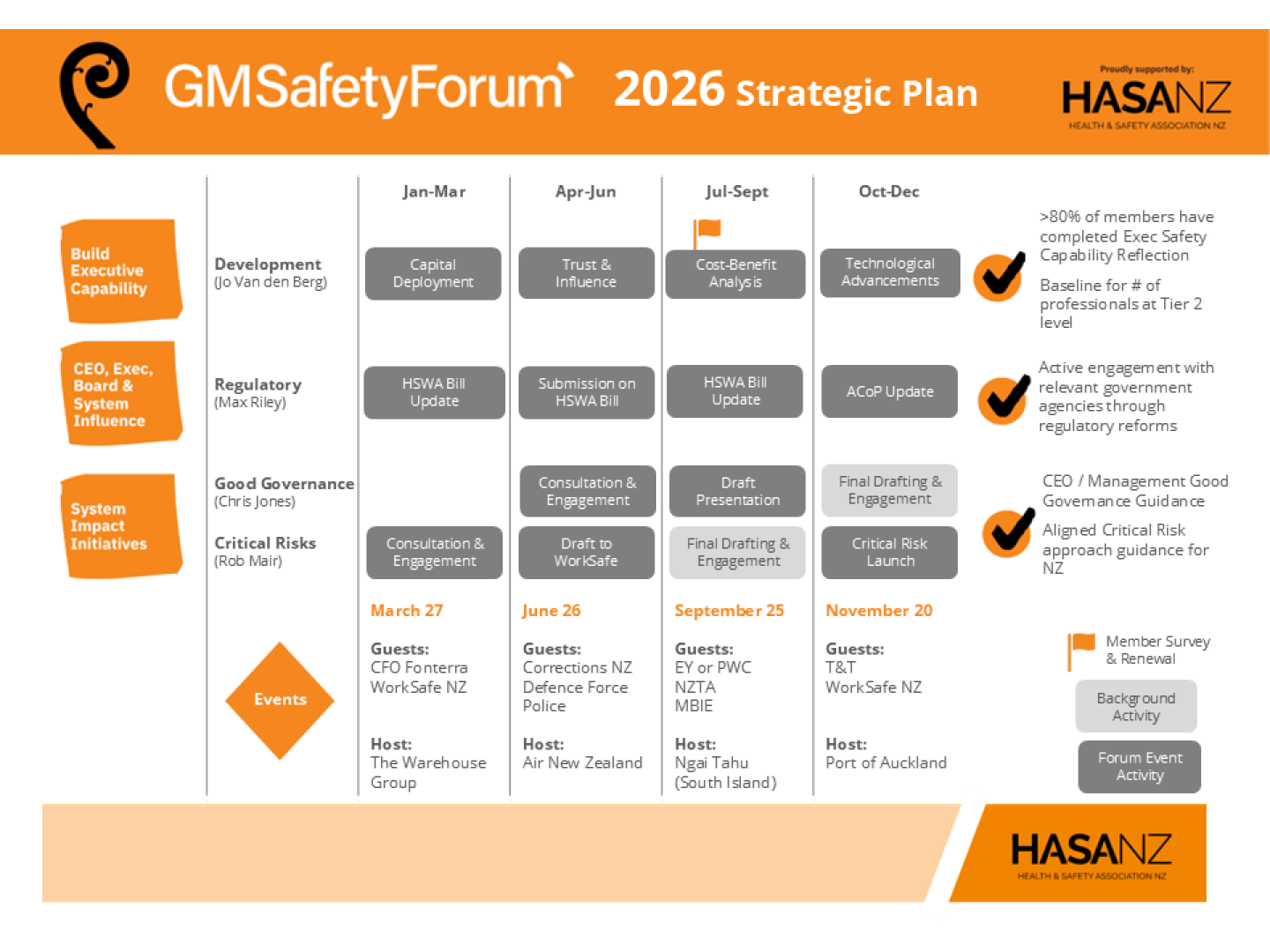 The GM Safety Forum addresses a significant need by acting as a voluntary support network for executive-level professionals responsible for safety and well-being who may not necessarily possess a technical health and safety background. While professional organisations typically cater to technical specialists, the Forum specifically fills the gap for these executives. It ultimately supports members in strengthening their executive health and safety capabilities and offers a platform for collaboration aimed at enhancing New Zealand’s health and safety system and performance.